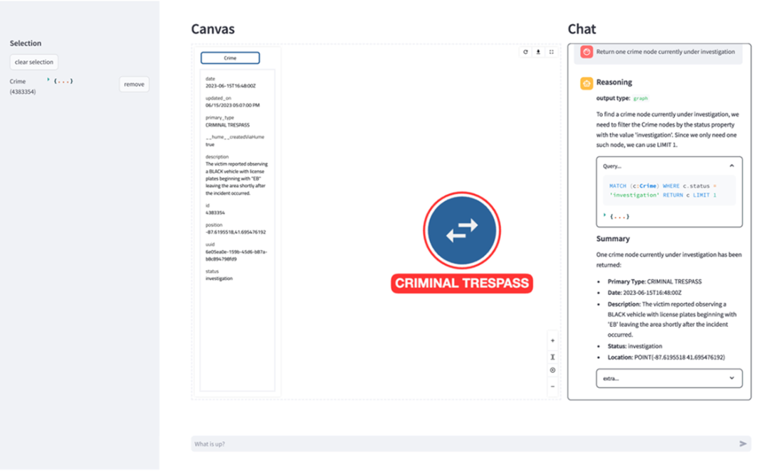 Initial query response showing a crime node currently under investigation. The interface displays the current selection, the node's detailed properties in the selection panel (left), the node visualization in the canvas (center), and the query processing details in the chat interface (right).