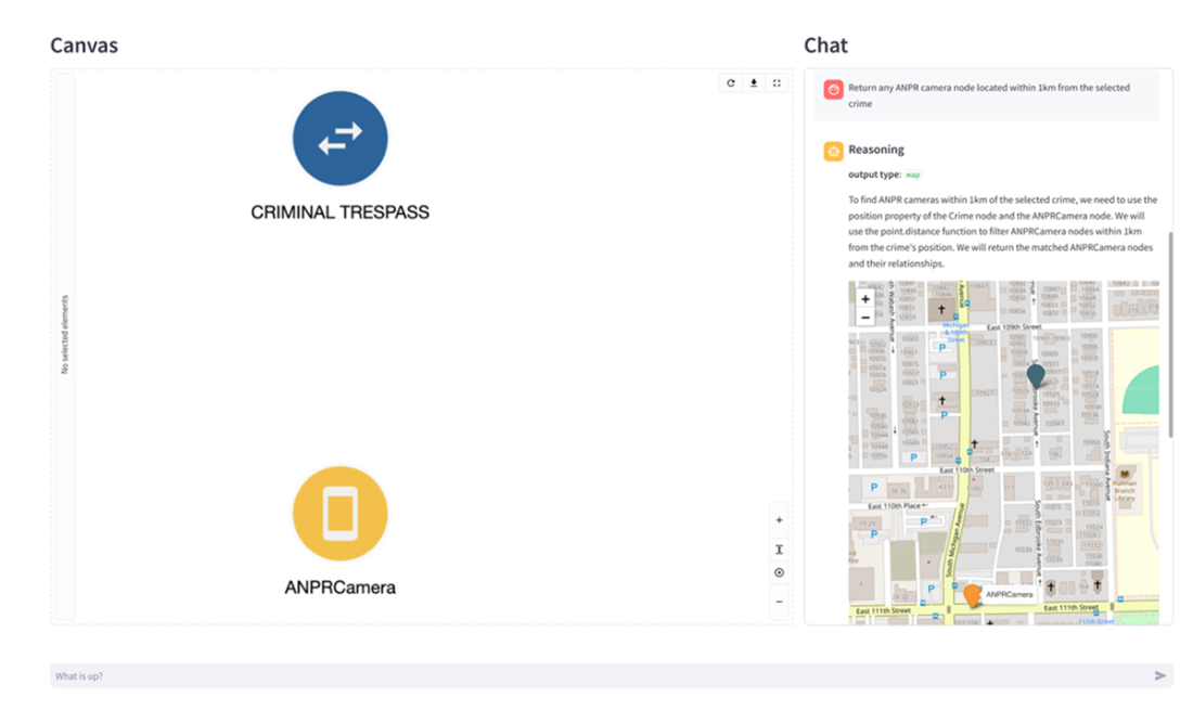 Spatial query response showing an ANPR camera near the crime location. The system automatically chose a map visualization to display the spatial relationship between the crime and the nearby ANPR camera