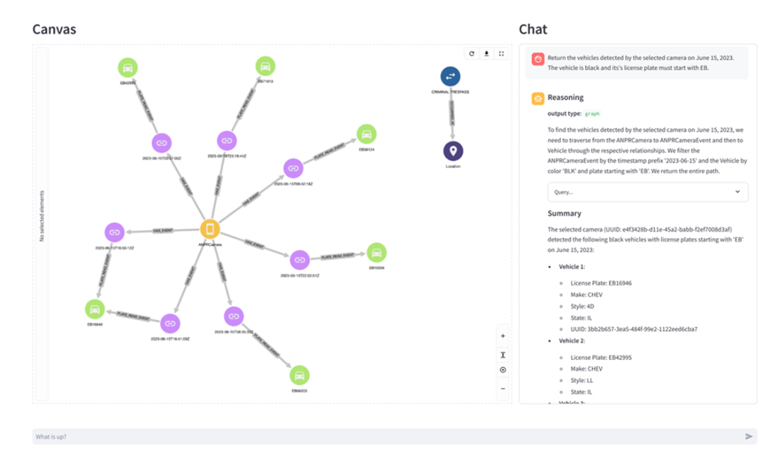 Vehicle query results showing matching vehicles and their detection events. Each path represents a complete vehicle detection record, with timestamps visible on the event nodes. The system's response includes both the graph visualization and a detailed summary of each vehicle's properties.