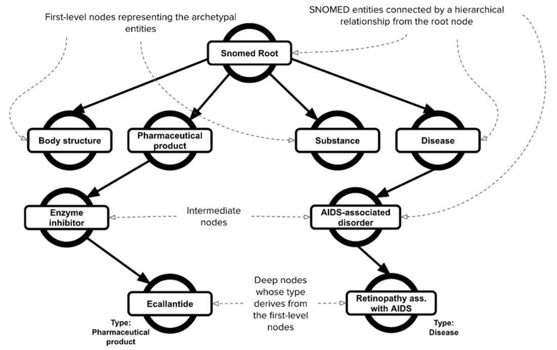 A sample of the hierarchical structure of the SNOMED ontology. Leveraging this hierarchical structure, nodes located on a deeper level, such as “Ecallantide” and “Retinopathy associated with AIDS”, can be categorized using the information from the first-level nodes, such as “Pharmaceutical product” and “Disease”, which represent the archetypal entities of the ontology.