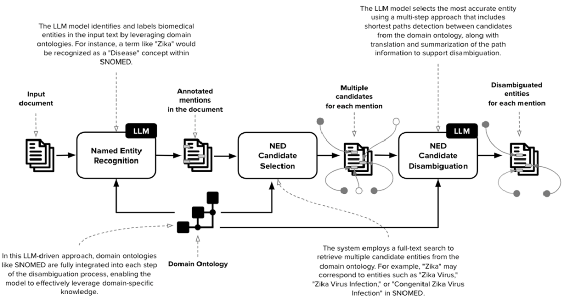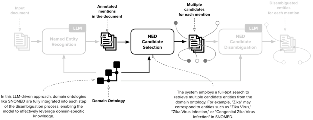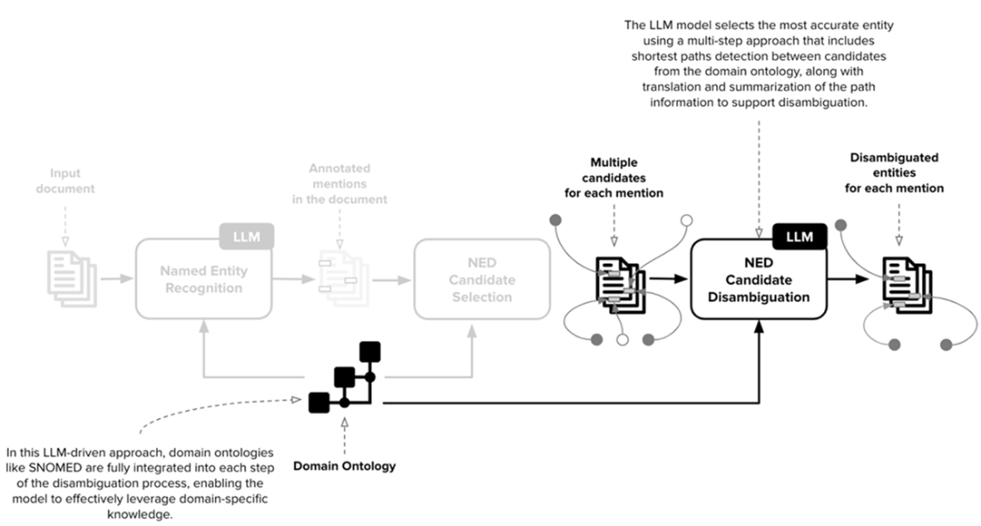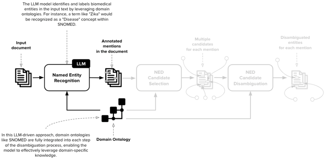 - To reach this goal, we can deploy a flexible end-to-end process for NED, including multiple phases involving LLMs and domain ontologies, such as Named Entity Recognition (NER), NED Candidate Selection, and NED Candidate Disambiguation.