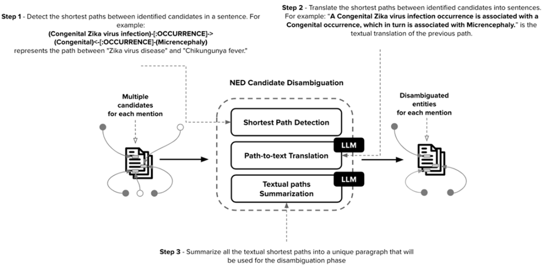 Candidate disambiguation combines graph algorithms and LLM reasoning in three steps: shortest-path detection between candidates within the ontology (with hub filtering and limited hops for relevance), path-to-text translation that turns the discovered graph paths into natural-language statements, and summarization that condenses many sentences into a compact context. The final LLM prompt uses this distilled, ontology-grounded context to pick the best candidate per mention—e.g., preferring “Congenital Zika virus infection” when “microcephaly” co-occurs. The result is an end-to-end NED workflow that is accurate in sparse or ambiguous contexts, portable across domains with suitable ontologies, privacy-friendly when run locally, and extensible with improvements such as vector-based candidate retrieval.