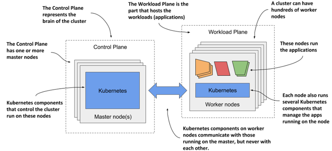 - A Kubernetes cluster consists of master and worker nodes. The master nodes run the Control Plane, which controls the entire cluster, while the worker nodes run the deployed applications or workloads, and therefore represent the Workload Plane.