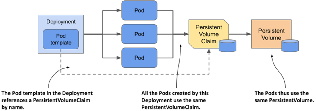 All Pods from a Deployment use the same PersistentVolumeClaim and PersistentVolume.