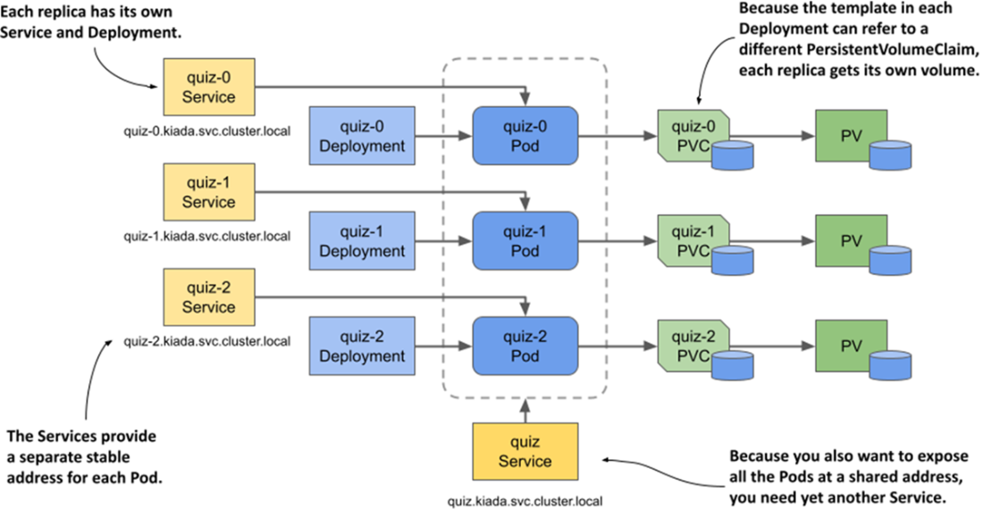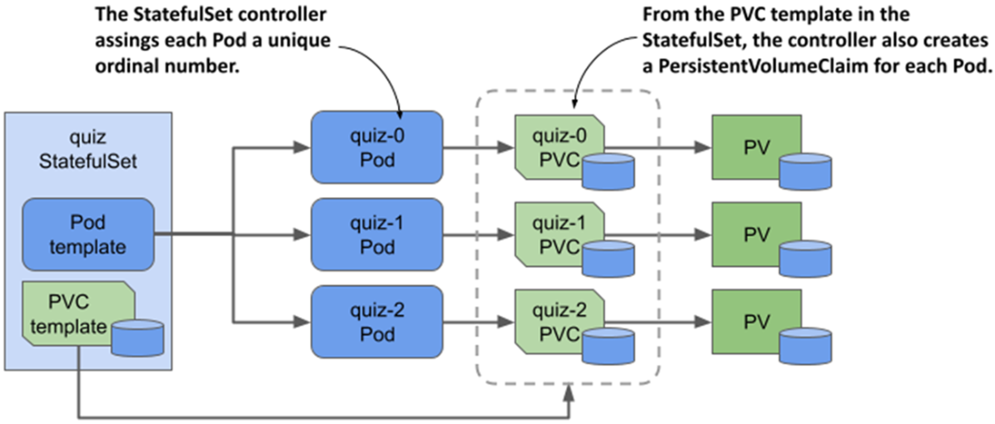 - A StatefulSet ensures that each replica gets its own stable identity and its own PersistentVolumeClaim(s). These claims are always associated with the same Pods.
