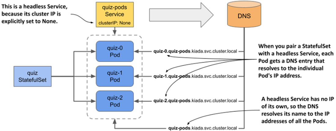 - In combination with a StatefulSet, a headless Service ensures that each Pod receives a DNS record that always resolves to the Pod’s IP address, even if the Pod is moved to another node and receives a new IP address.