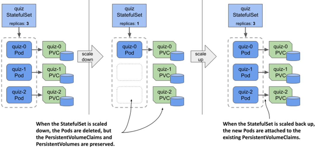 StatefulSets don’t delete PersistentVolumeClaims when scaling down; then they reattach them when scaling back up.