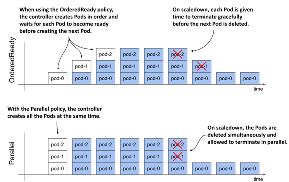 Comparison between the OrderedReady and Parallel Pod management policy