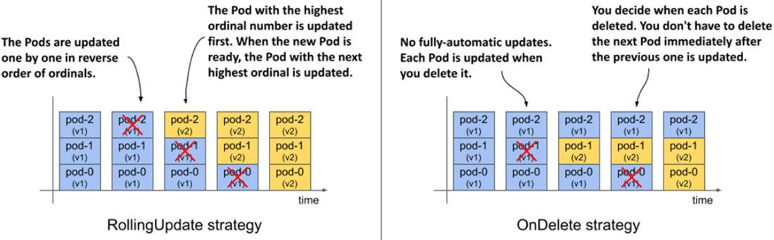 - When you update the Pod template in a StatefulSet, the controller updates the underlying Pods. This happens on a rolling basis, from highest to lowest ordinal number. Alternatively, you can use a semi-automatic update strategy, where you delete a Pod and the controller then replaces it.