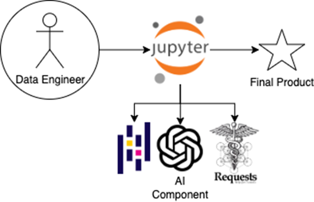 In earlier chapters, the data engineer acted as a go-between—manually passing instructions between an AI coding companion and the coding environment. Now, the AI component is embedded directly within the workflow, alongside libraries like Requests and Pandas, enabling natural language tasks (like sentiment analysis) to execute as native steps within the Jupyter notebook