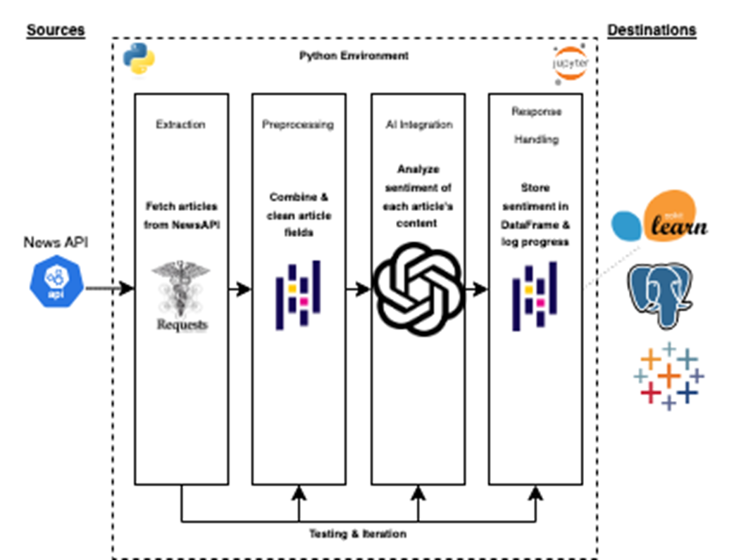 This diagram illustrates the full mental model for the use case. Articles are fetched from the NewsAPI using the requests library, then preprocessed into clean content blocks. The OpenAI API is embedded within the Python environment to analyze sentiment, returning structured labels. Finally, results are stored in a pandas DataFrame and logged—ready for downstream use in tools like scikit-learn, PostgreSQL, or Tableau.