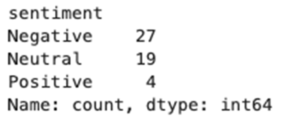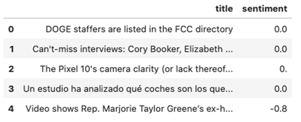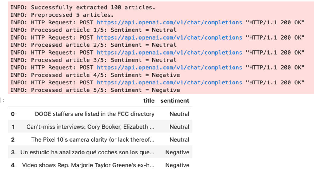 This figure shows the results of the full AI-powered sentiment pipeline. The top portion displays logging output for each step, including API requests and processed sentiment labels. The bottom shows the final pandas DataFrame, where each article title is paired with a normalized sentiment category. Results will vary over time, as the input depends on live Tesla news retrieved from NewsAPI.