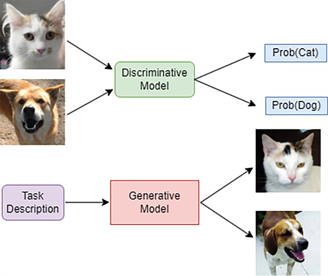 A comparison of generative models versus discriminative models. A discriminative model (top half of the figure) takes data as inputs and produces probabilities of different labels, which we denote by Prob(dog) and Prob(cat). In contrast, a generative model (bottom half) acquires an in-depth understanding of the defining characteristics of these images to synthesize new images representing dogs and cats.