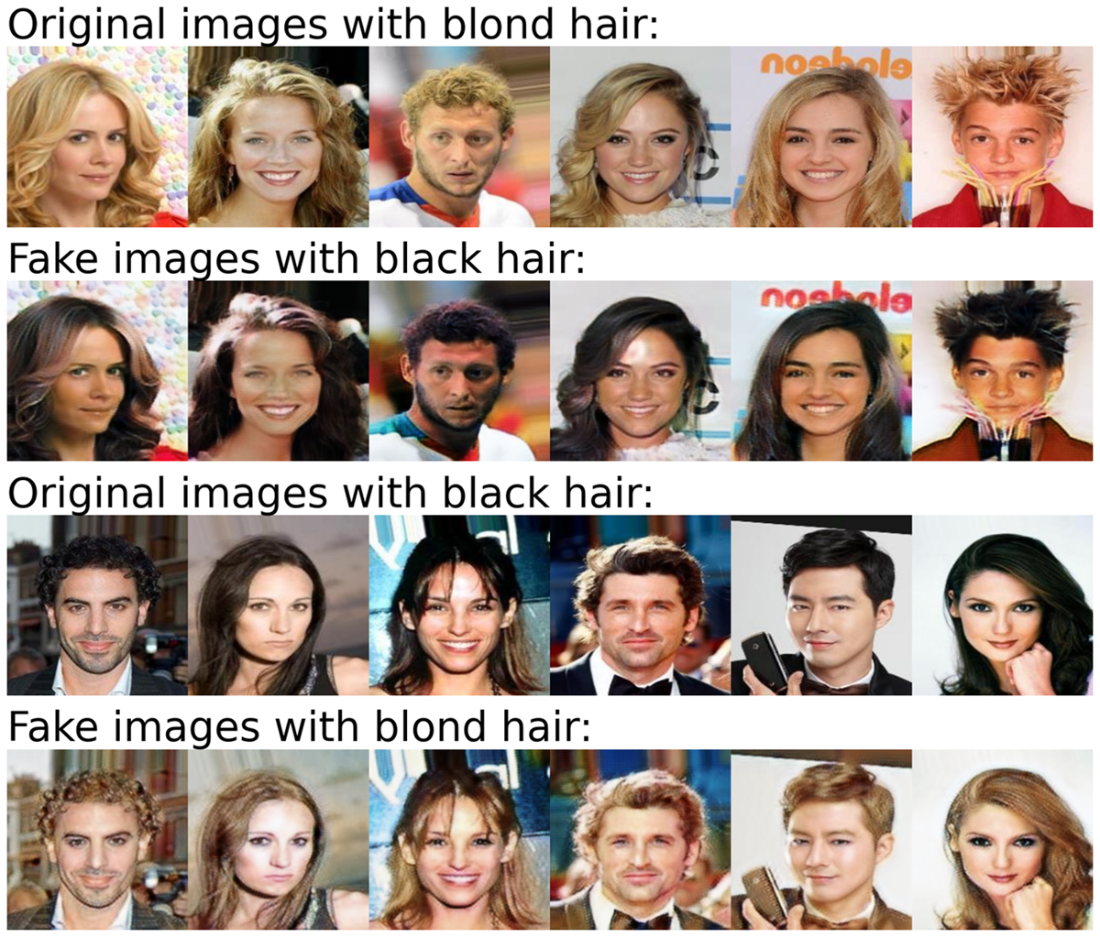 Changing hair color with CycleGAN. If we feed images with blond hair (first row) to a trained CycleGAN model, the model converts blond hair to black hair in these images (second row). The same trained model can also convert black hair (third row) to blond hair (bottom row).