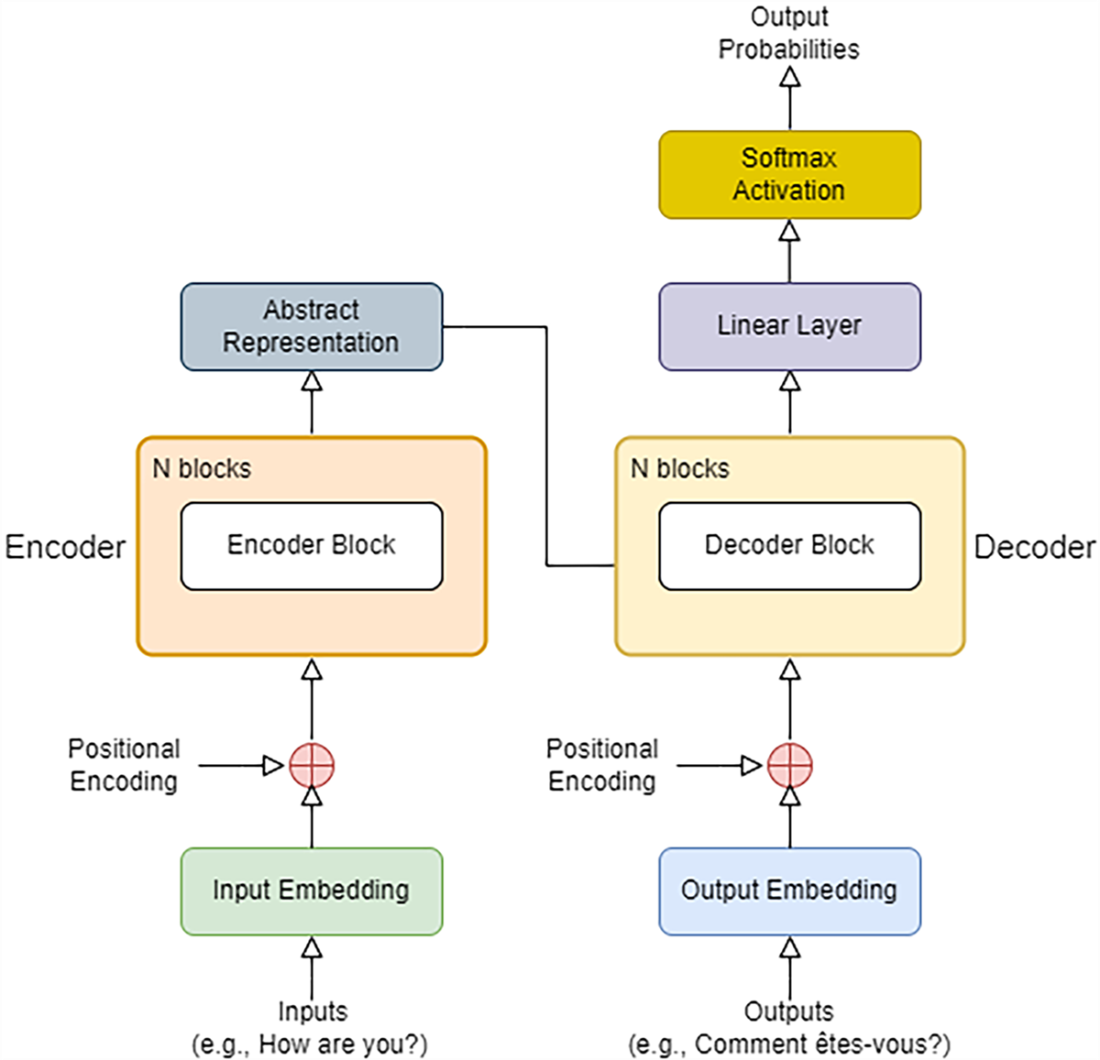 The Transformer architecture. The encoder in the Transformer (left side of the diagram) learns the meaning of the input sequence (e.g., the English phrase “How are you?”) and converts it into an abstract representation that captures its meaning before passing it to the decoder (right side of the diagram). The decoder constructs the output (e.g., the French translation of the English phrase) by predicting one word at a time, based on previous words in the sequence and the abstract representation from the encoder.