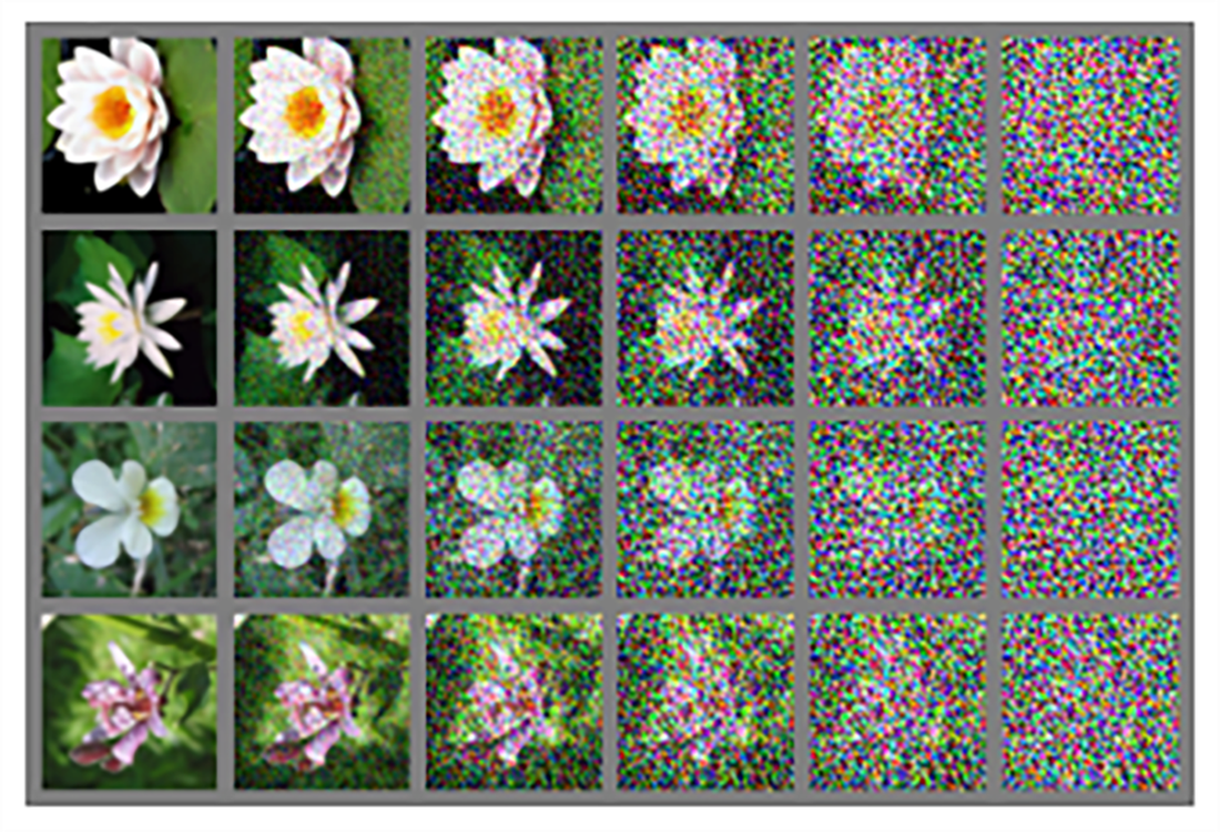 The diffusion model adds more and more noise to the images and learns to reconstruct them. The left column contains four original flower images. As we move to the right, some noise is added to the images in each step, until at the right column, the four images are completely noisy images. We then use these images to train a diffusion-based model to progressively remove noise to generate new data samples.