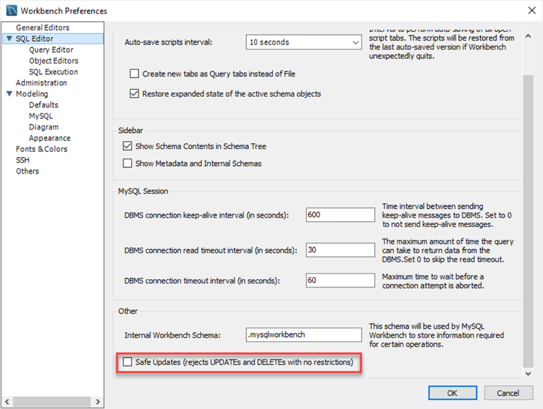 Safe Updates is a Workbench safety feature that, by default, prevents updates/deletes without a key-based filter to reduce accidental wide changes. If your tables lack keys, Workbench may block your statements. You can disable it in Edit > Preferences > SQL Editor > uncheck “Safe Updates” (restart Workbench). Re-enable it when you’re done to keep protection.How do I set a column to NULL?