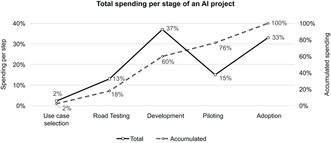 details the percentage of time spent by the project team during the phases of a typical AI project