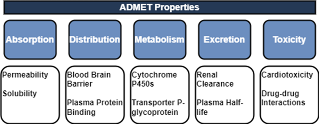 We can break down the ADMET properties into the following broad descriptions. Absorption refers to the process by which a drug enters the bloodstream from its administration site, such as the gastrointestinal tract for oral drugs or the respiratory system for inhalation drugs. Distribution pertains to the movement of a drug within the body once it has entered the bloodstream. Metabolism refers to the biochemical transformation of a drug within the body, primarily carried out by enzymes. Metabolic processes aim to convert drugs into more polar and water-soluble metabolites, facilitating their elimination from the body. Excretion involves the removal of drugs and their metabolites from the body. Toxicity assessment aims to evaluate the potential adverse effects of a drug candidate on various organs, tissues, or systems.