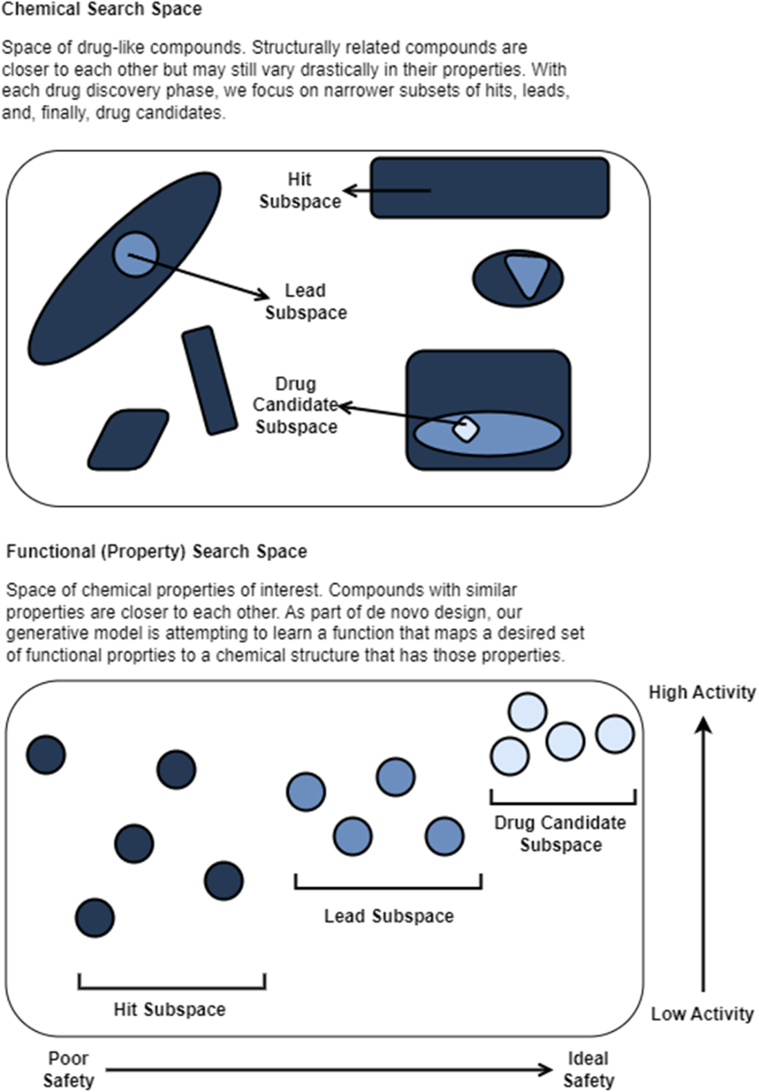 In virtual screening, we conducted our search across a chemical space consisting of an enormous set of molecules. In de novo design, we are still conducting an (informal) search, just not across the chemical space. We are now searching across the functional space of potential molecular properties. If our model “learns” which section of the functional space maps to molecules that have ideal binding affinity and safety, then perhaps it can reverse-engineer novel molecule structures in the chemical space that match our functional criteria.