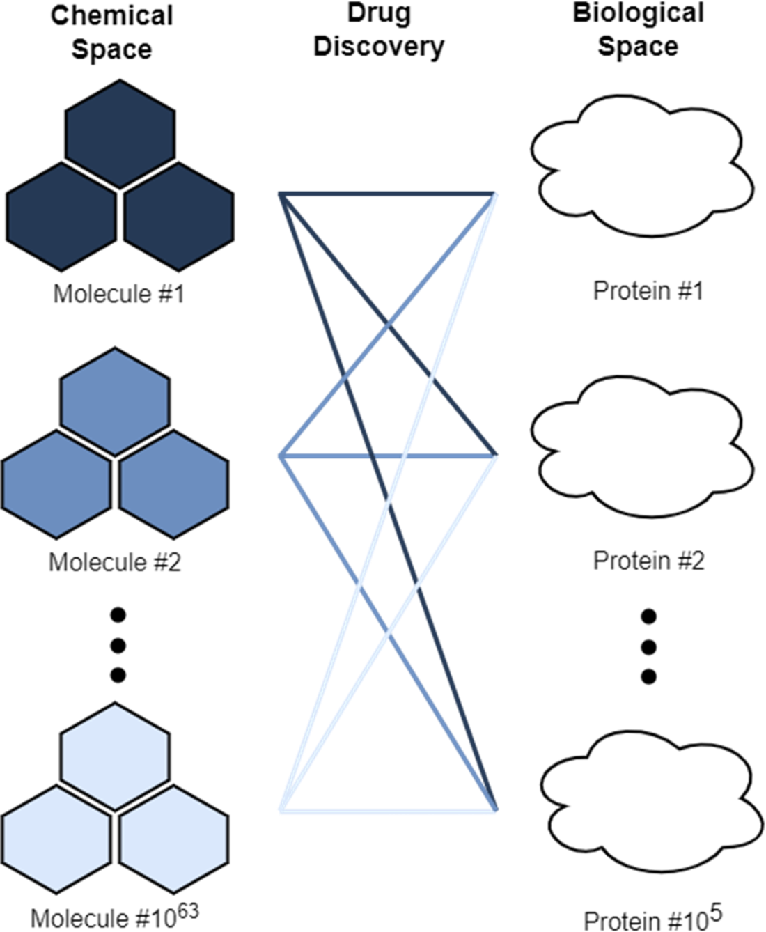 - Drug discovery can be thought of as a difficult search problem that exists at the intersection of the chemical search space of 1063 medicinal compounds and the biological search space of 105 targets.
