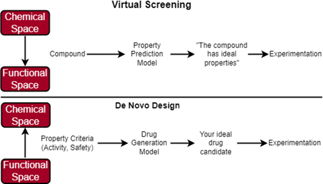 In virtual screening, we start with a large, diverse library of compounds that we can filter using a predictive model that has learned to predict what properties each compound has. Our predictive model has learned how to map the chemical space to the functional space. If the compound is predicted to have optimal properties, we carry it over for further experiments. In de novo design, we start with a defined set of property criteria that we can use along with a generative model to generate the structure of our ideal drug candidate. Our generative model knows how to map the functional space to the chemical space.