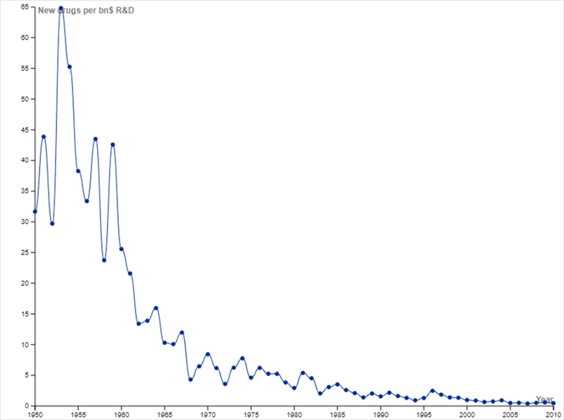 New drugs per billion USD of R&D reflects a downward trajectory. You may have heard of Moore’s Law, which is the observation that the number of transistors on an integrated circuit doubles approximately every two years. Moore’s Law implies that computing power doubles every couple of years while cost decreases. Eroom’s Law (Moore spelled backwards) is the observation that the inflation-adjusted R&D cost of developing new drugs doubles roughly every nine years. Eroom’s Law reflects diminishing returns in developing new drugs, including factors such as lower risk tolerance by regulatory agencies (the “cautious regulator” problem), the “throw money at it” tendency, and need to show more than a modest incremental benefit over current successful drugs (the “better than the Beatles” problem). The plot was constructed with data from Scannell et al., which discusses the trend in greater detail [6].
