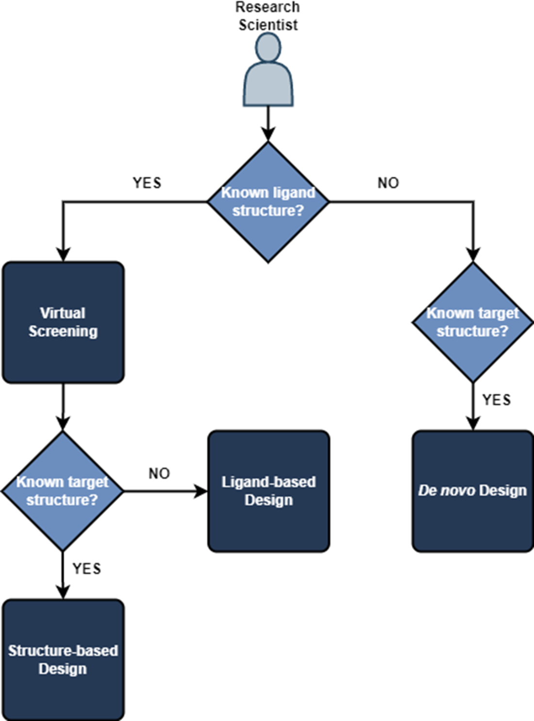 If we know both the structure of our ligand or compound and the target, we can use structured-based design methods. If we only know the ligand structure, we are restricted to ligand-based design methods. Alternatively, if we only know the target structure, we can use de novo design to guide generation of a suitable drug candidate.