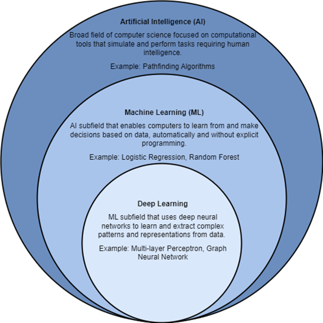 - ML is a subfield of AI that enables computers to learn from and make decisions based on data, automatically and without explicit programming or rules on how to behave. Example ML algorithms include logistic regression and random forests. Deep learning is a subfield of ML that uses deep neural networks to extract complex patterns and representations from data.