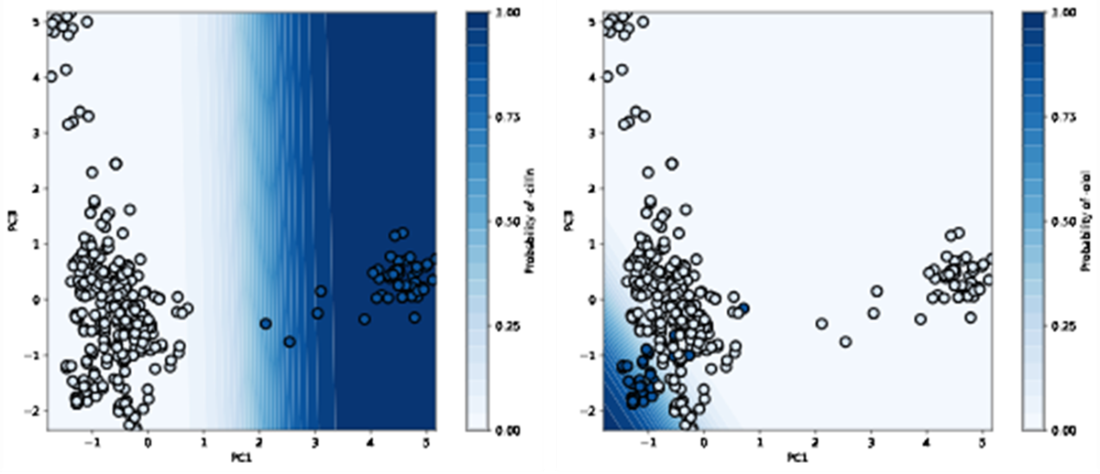 Decision boundary of our logistic regressor for classifying “-cillin” (left) and “-olol” (right) USAN stems. For each plot, colored samples belong to the positive class and uncolored samples belong to the negative class.