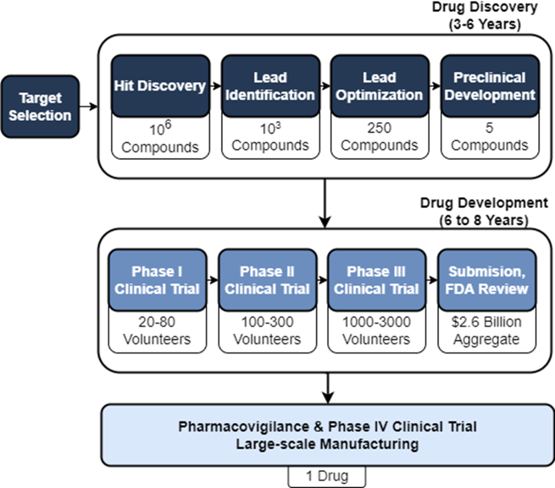 We can breakdown drug design into target identification and validation, hit discovery, hit-to-lead (lead identification), lead optimization, and preclinical development. Once a drug candidate has progressed to the drug development stage, it will need to pass multiple phases of clinical trials testing safety and efficacy prior to submission to and review by the FDA and launch to market.