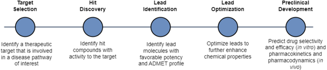 - We can segment the early drug discovery pipeline into four main phases: target identification, hit discovery, hit-to-lead or lead identification, and lead optimization. Target identification designates a valid target whose activity is worth modulating to address some disease or disorder. Hit discovery uncovers chemical compounds with activity against the target. Lead identification selects the most promising hits and lead optimization improves their potency, selectivity, and ADMET properties to be suitable for preclinical study.