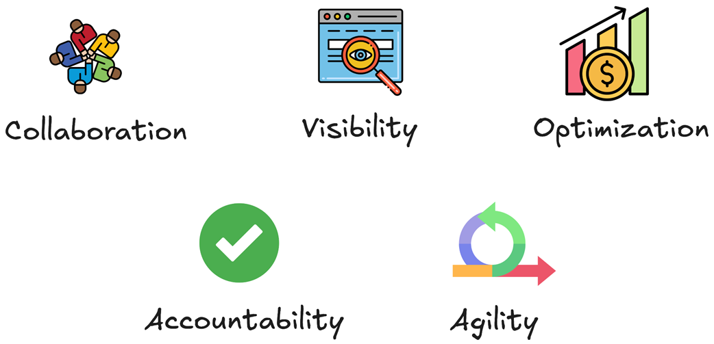 - Collaboration: Finance, engineering, and operations share responsibility for costs.- Transparency: Real-time visibility with dashboards, reports, and alerts.