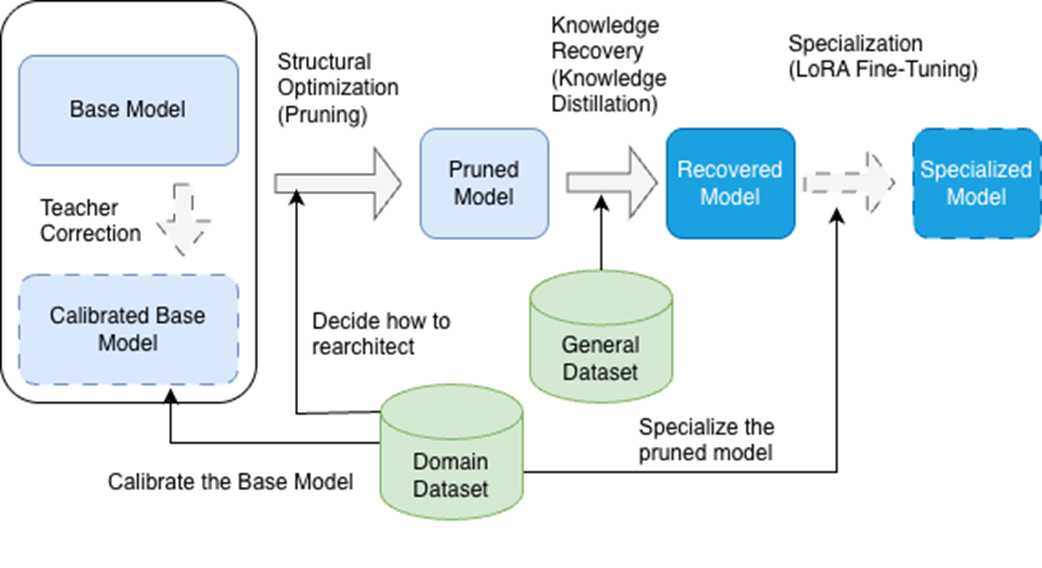 The model tailoring pipeline consists of core phases (shown with solid arrows) and optional phases (shown with dashed arrows). In the first phase, we adapt the structure to the model's objectives through pruning. Next, we recover capabilities it may have lost through knowledge distillation. Finally, we can optionally specialize the model through fine-tuning. An optional initial phase calibrates the base model using the dataset we'll use to specialize the final model.