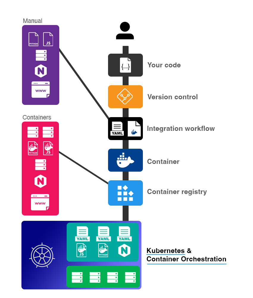 Coordinating these consistently across machines is a key deployment challenge.What do containers actually do?Containers bundle your app with its dependencies into a portable image that can run consistently across many environments. You build an image (often from a Dockerfile), push it to a registry to share, and run it with a container runtime. Containers work well for a wide range of open-source software, from languages and web servers to databases and message queues.What challenges arise when using containers without orchestration?
