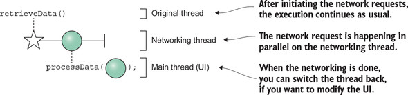 This chapter recasts Android networking as reactive event streams to tame callback-heavy code. It introduces building the network layer with RxJava and Retrofit, emphasizing the decoupling of data sources from subscribers and the benefits of composing asynchronous flows. You learn the core roles of observables and subscribers, thread switching with observeOn for UI updates, and the RxJava 2 family of types (Observable, Single, Maybe, Completable, Flowable) and when to use them in typical app scenarios.
