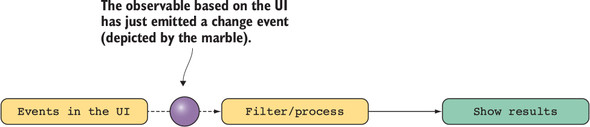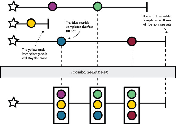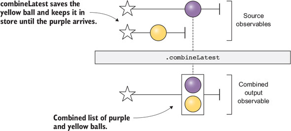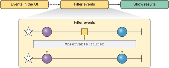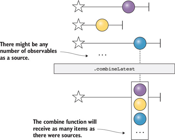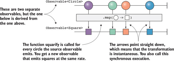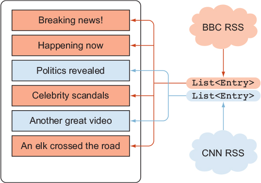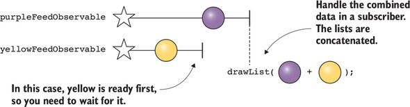 The chapter models a network request as an observable that emits a single item and completes, then extends this into a practical example: an RSS/Atom reader that aggregates multiple feeds. Each feed becomes an Observable>; combineLatest merges their latest emissions into one stream, after which map transforms the data (for example, sorting by date) before rendering. Along the way, it demonstrates building clear, one-step-at-a-time processing chains, converting between observable types when needed, and ensuring UI work happens on the main thread.