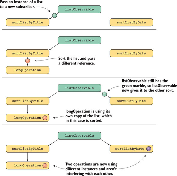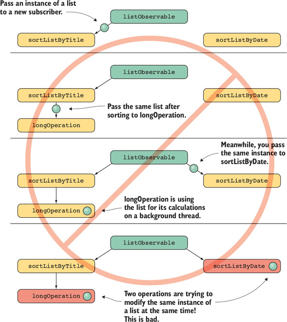 How do I model a network request as an observable in RxJava?You expose a function that returns an Observable (often a Single for one-shot responses) and subscribe to it. Subscribing starts the request, and when the data arrives the subscriber is called. Because callbacks likely run off the main thread, switch to the UI thread just before subscribing with observeOn(AndroidSchedulers.mainThread()). Retrofit integrates well here and can return Observable/Single directly.Which RxJava 2 type should I use for HTTP calls?- Single: best for a one-time response (value or error) typical of HTTP calls. You can convert it to Observable with toObservable(). - Maybe: for an optional single value (value or complete without value). - Completable: when you only care that something finished (no value), e.g., a side-effect. - Observable: for multiple values over time. - Flowable: for high-throughput streams with backpressure needs (usually not needed for Android UI networking).What’s the difference between Observer and Subscriber in RxJava 2?Most types (Observable, Single, Maybe, Completable) use Observer to receive emissions. Flowable is the special case that uses Subscriber because it supports backpressure. In practice, you can think of them all as “subscribers” that react to emitted items.How can I combine results from multiple network calls?Use combineLatest. It waits until each source has emitted at least one item, then emits a combined value whenever any source updates. Provide a combining function to merge the results (for example, concatenate two List<Entry>). For resilience, apply retry(n) and onErrorReturn(...) to each source before combining so one failing feed doesn’t cancel the whole result.How do I ensure UI updates happen on the main thread?Keep the network work on a background thread (Retrofit/your wrapper will do this), then switch downstream operators and subscribers to the main thread just before UI changes: observable.observeOn(AndroidSchedulers.mainThread()).subscribe(...). observeOn affects all following operations.How do I sort and transform network data with Rx?Use map to apply a pure function to each emission. For example, implement Comparable in your Entry and write a sortList(List<Entry>) that returns a new, sorted copy. Then do listObservable.map(this::sortList) and subscribe your UI to the sorted stream. Note: heavy work inside map can block the current thread.Why is immutability important in Rx chains?Because the same emitted item can flow to multiple subscribers/operators, mutating shared data causes races and unpredictable behavior. Always treat inputs as read-only and return new instances when “changing” data (copy a list before sorting, use builder patterns for objects). The extra allocations are typically a small cost on modern runtimes.How should I handle network errors with RxJava?Errors are notifications that terminate the stream. You can: 1) provide an error consumer in subscribe to log/show issues; 2) retry transient failures with retry(n) on each source; 3) recover with fallback data using onErrorReturn(e -> Collections.emptyList()) so the UI can still render partial results. Place onErrorReturn after retry so retries happen first.How do I scale from two feeds to many?Create a List<Observable<List<Entry>>>, applying retry and onErrorReturn to each. Then call combineLatest(observableList, combiner) where the combiner aggregates the emitted lists into a single list. This version doesn’t require you to know the number of feeds at compile time.When do I need Flowable and backpressure?Only when a source can outpace consumers with a very high volume of items (for example, IoT sensor streams). Typical Android UI/network scenarios work fine with Observable and its simpler buffering model; Flowable is usually overkill for these cases.