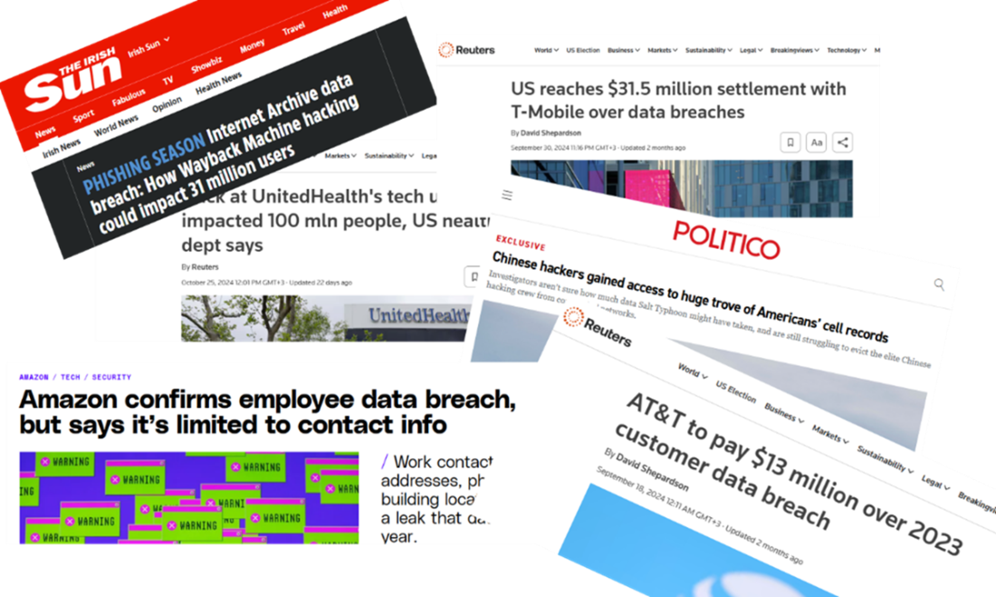Headlines showcasing major recent data breaches and security vulnerabilities, emphasizing the widespread impact on millions of users and the persistent threat to digital security.