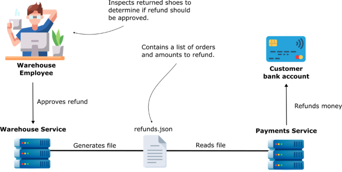 ACME Inc. staff approve refunds using the warehouse management application. Once a day the warehouse management application generates a refunds.json file. The payment service refunds customer credit cards for the amount specified in the refunds.json file.
