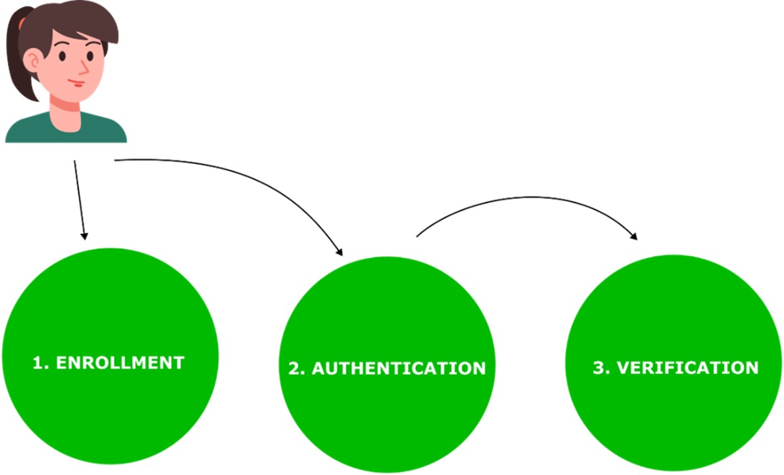 A three-step process. Initially, a sure needs to register their data. Following registration, the user can try to authenticate and get verified by the system.