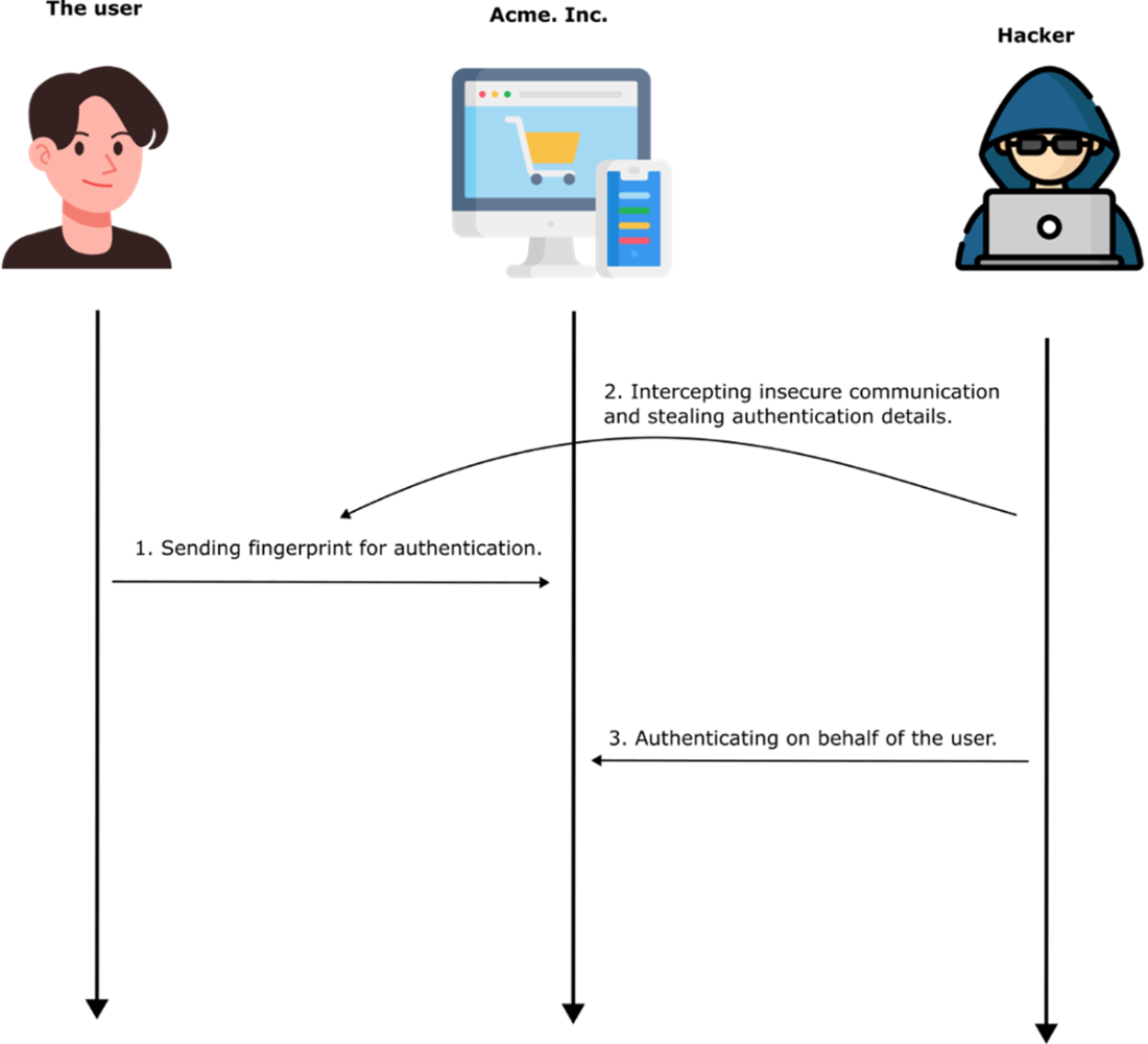 Improperly secured transmission and storage of biometric authentication data can expose it to hackers, who may then exploit it in replay attacks.