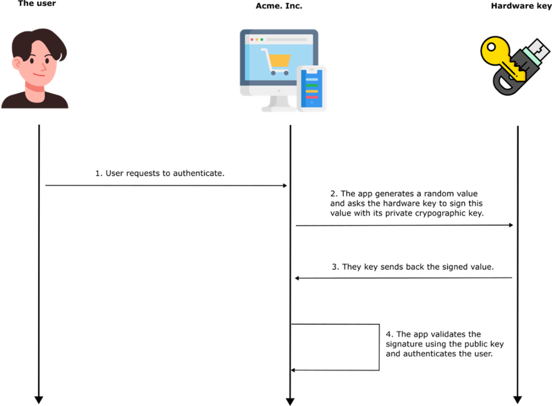 The authentication process using a hardware key. The app generates a random value and asks the key to sign it with its private key. The app then verifies the signature using its public key. The public key from the pair needs to already be configured at the app level. This configuration happens during the registration step.