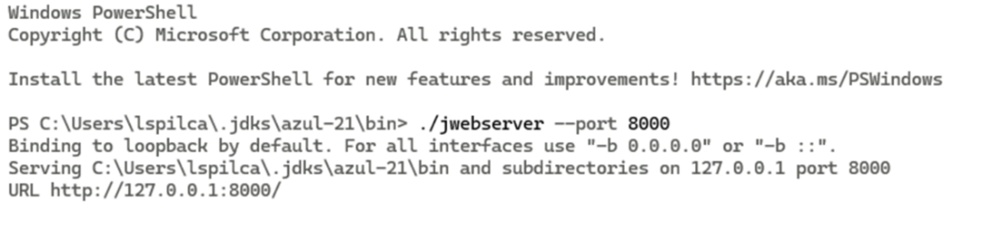 Running a local web server using the jwebserver command from the JDK. The server is started in the bin directory of the JDK installation, binding to 127.0.0.1 on port 8000. This allows the HTML page to be served over a secure context (localhost), which is required for WebAuthn functionality.