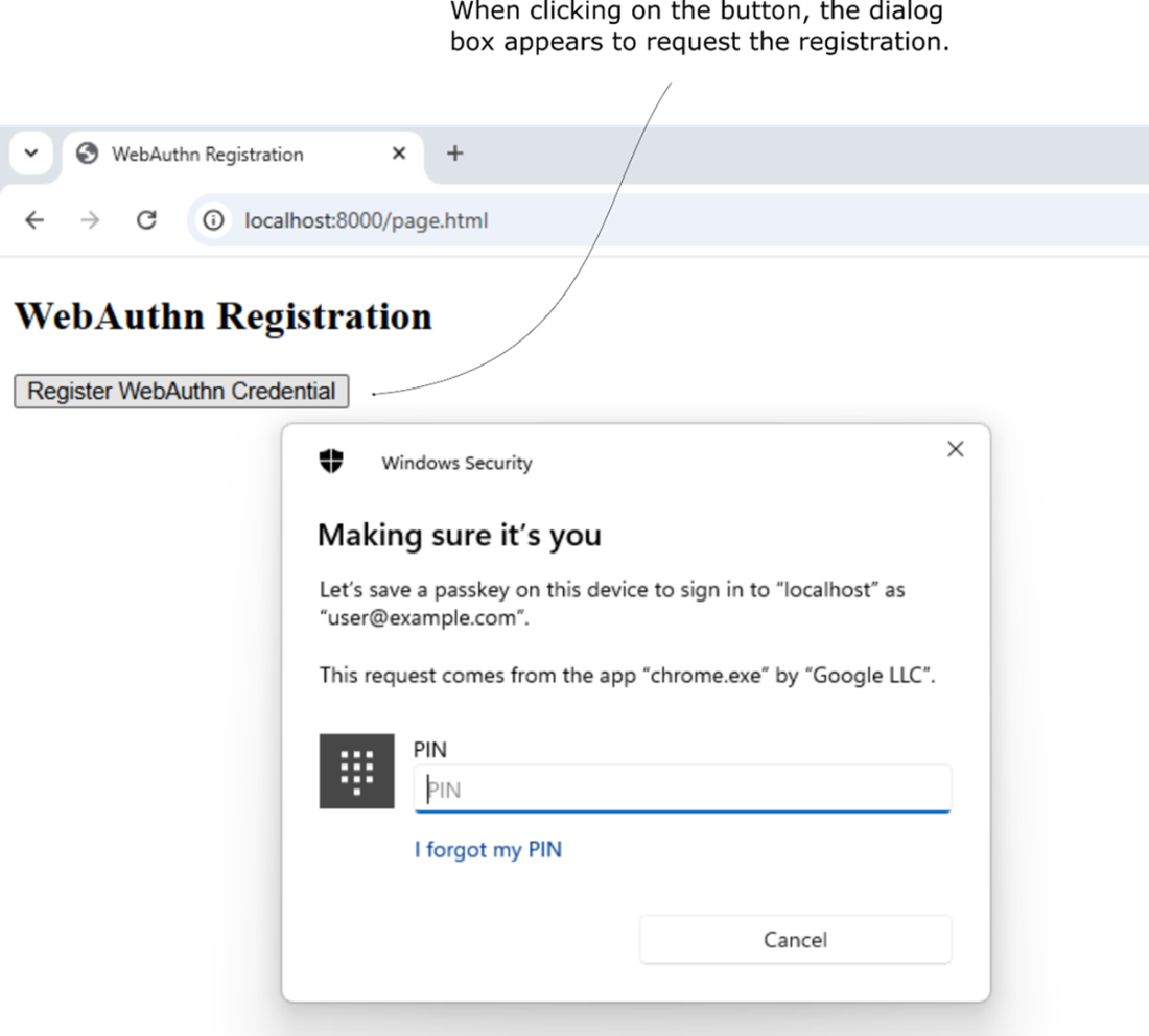 When the "Register WebAuthn Credential" button is clicked, the browser initiates the WebAuthn registration process. The system prompts the user with a Windows Security dialog to confirm their identity and save a passkey for the specified domain (localhost in this case), using platform authentication.