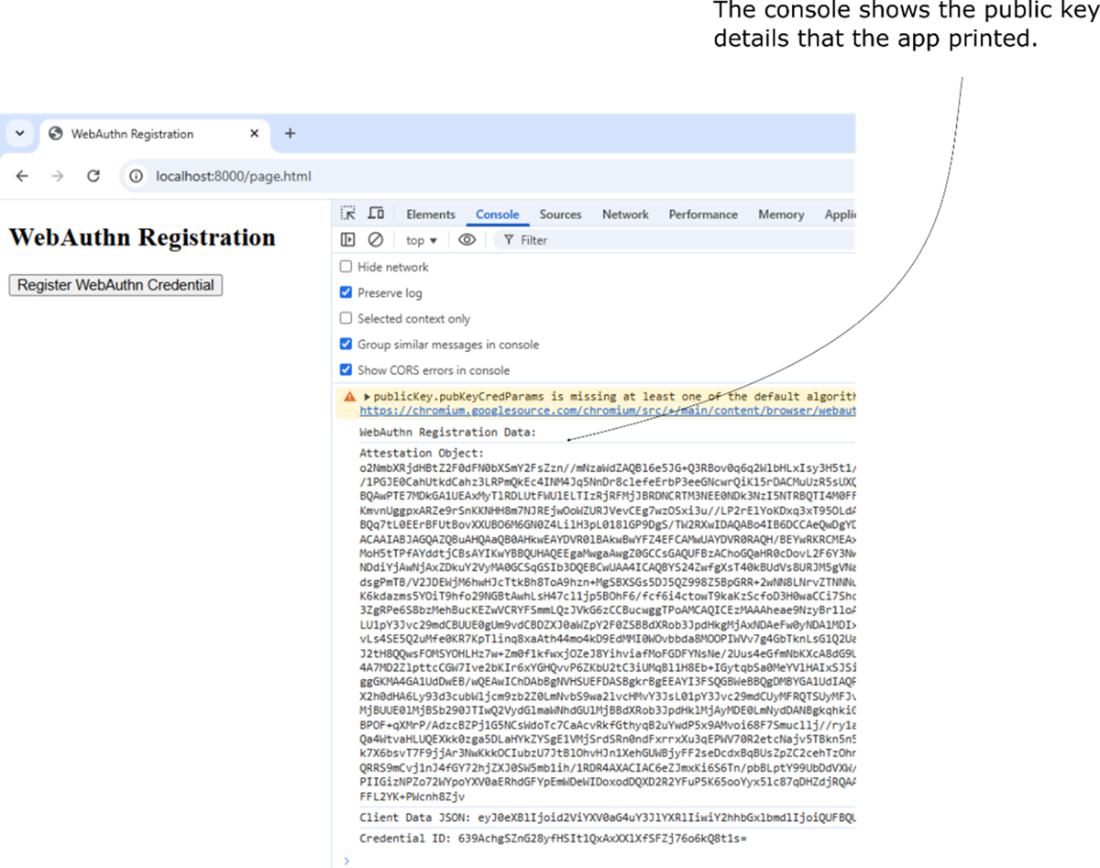 Output in the browser’s developer console after triggering the WebAuthn registration process. The console displays the attestation object and client data in base64-encoded form, representing the public key credential generated by the browser.