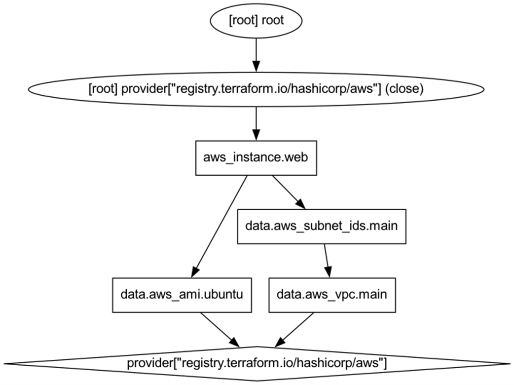 A Graph of the Terraform Plan. This graph was directly generated by Terraform using the terraform graph command.