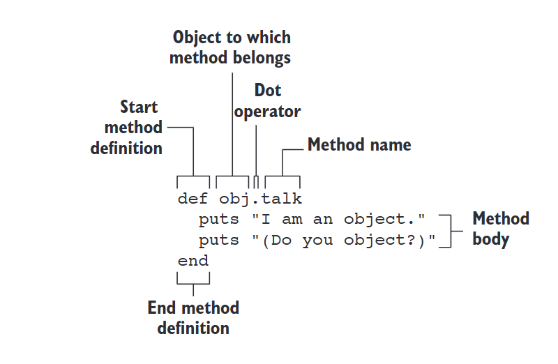 Sending a message is calling a method on a receiver using the dot operator:receiver.message. The object on the left is the receiver; the name on the right is usually a method. If no such method exists, Ruby raises a NoMethodError.How do I define a method for a single object (a singleton method)?