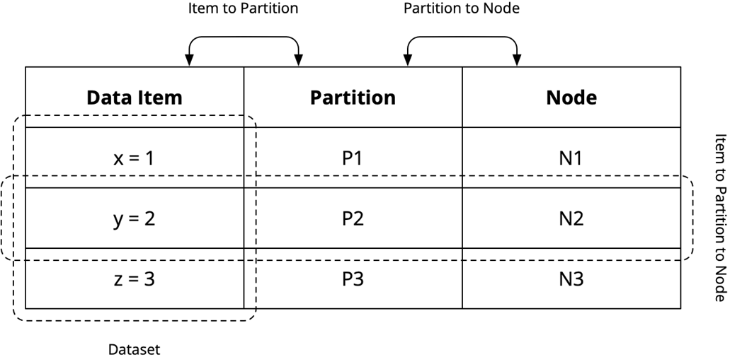 Assignment of data items to partitions and the assignment of partitions to nodes