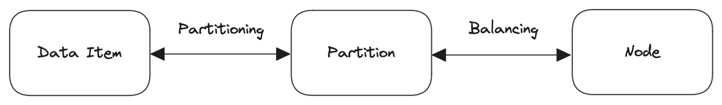 Partitioning assigns items to partitions while balancing assigns partitions to nodes.